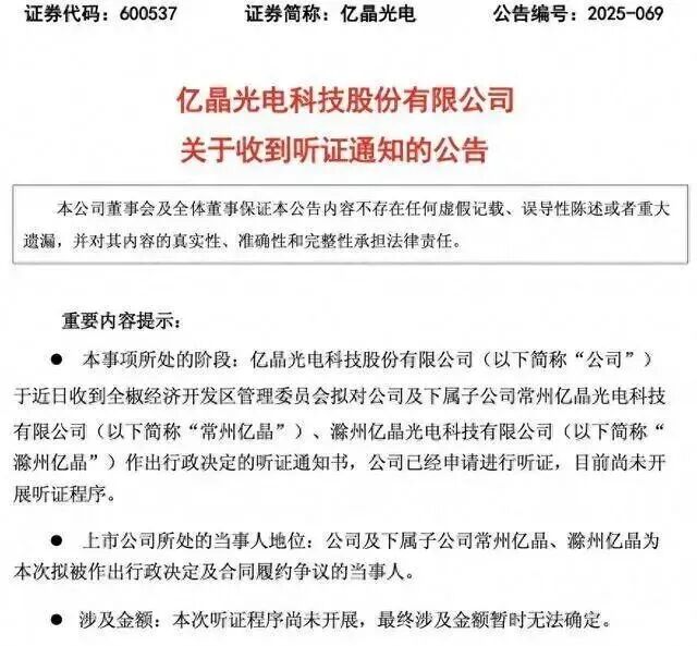 2025年12月28日,亿晶光电发布公告称,公司于近日收到全椒经济开发区管理委员会拟对公司及下属子公司常州亿晶光电科技有限公司(以下简称“常州亿晶”)、滁州亿晶光电科技有限公司(以下简称“滁州亿晶”)作出行政决定的听证通知书,拟解除投资协议、追回1.4亿元出资款,并追究公司代建费用、租金等相关违约责任。