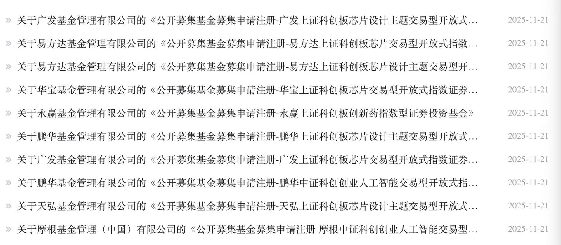 《每日经济新闻》记者获悉,11月21日晚间,证监会官网披露,多只科创板芯片类ETF以及首批科创创业人工智能ETF正式获批,有望吸引更多增量资金入市。