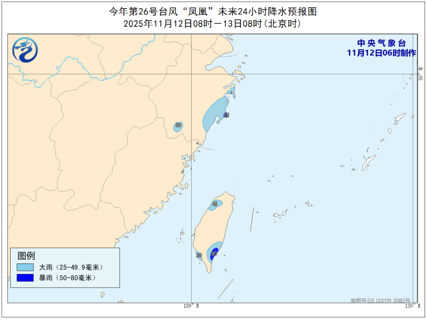 降水预报:12日8时到13日8时,浙江东部、台湾岛北部和南部将有大到暴雨(50—80毫米)。